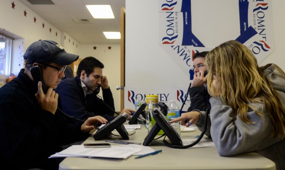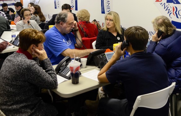 Volunteers make phone calls to prospective voters Tuesday at Mitt Romney’s Ohio headquarters in Columbus. Volunteers were calling to encourage people to get out to the polls.