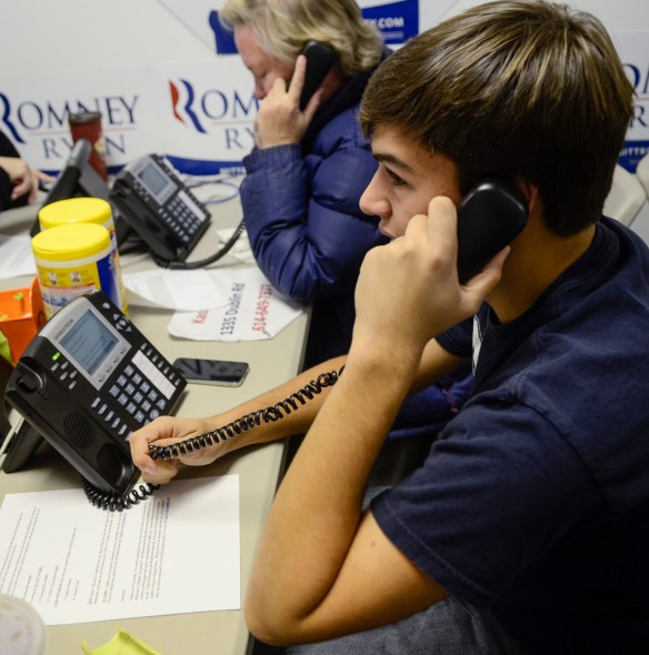 Volunteer Dalton Miller makes a phone call to a prospective voter Tuesday at Mitt Romney’s Ohio headquarters. People from as far as Texas united at the office to encourage voters to get out to vote.