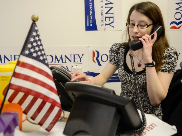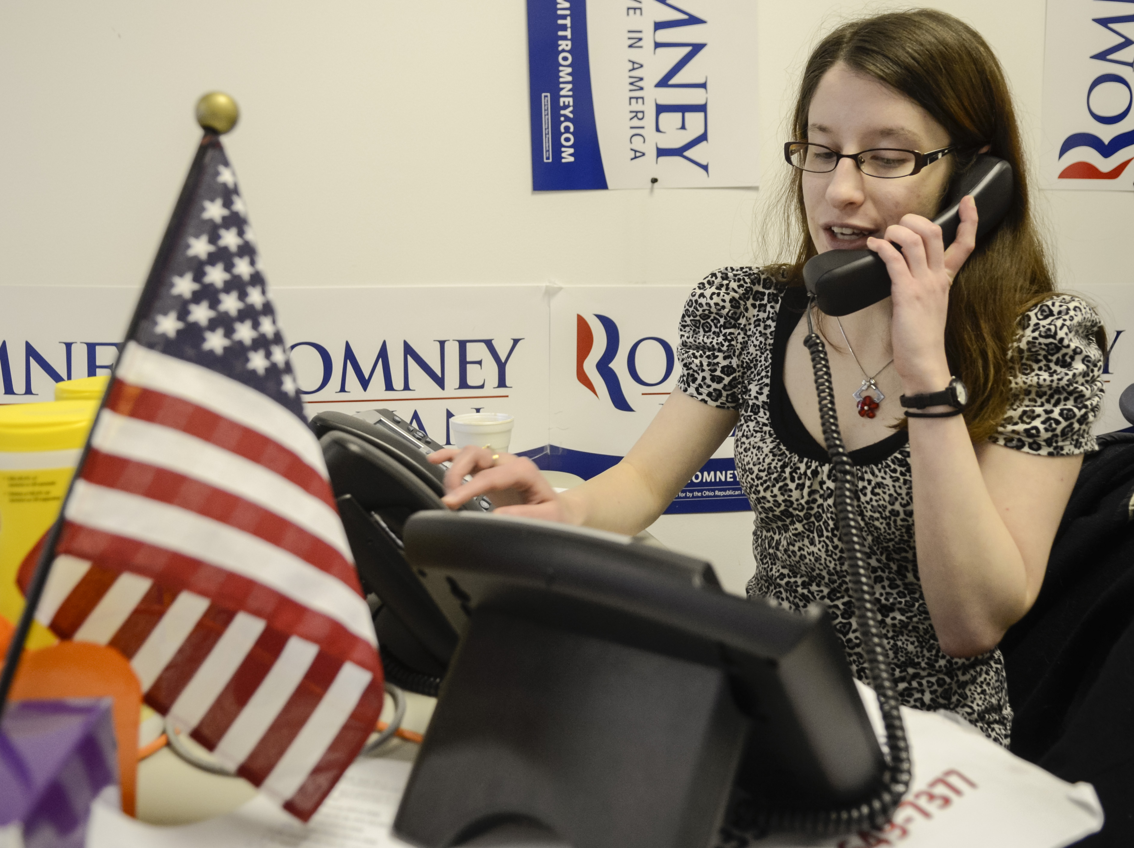 Intern Natalie Culshaw makes a phone call to a prospective voter Tuesday at Mitt Romney’s Ohio headquarters in Columbus. Volunteers worked frantically to get voters to the polls.