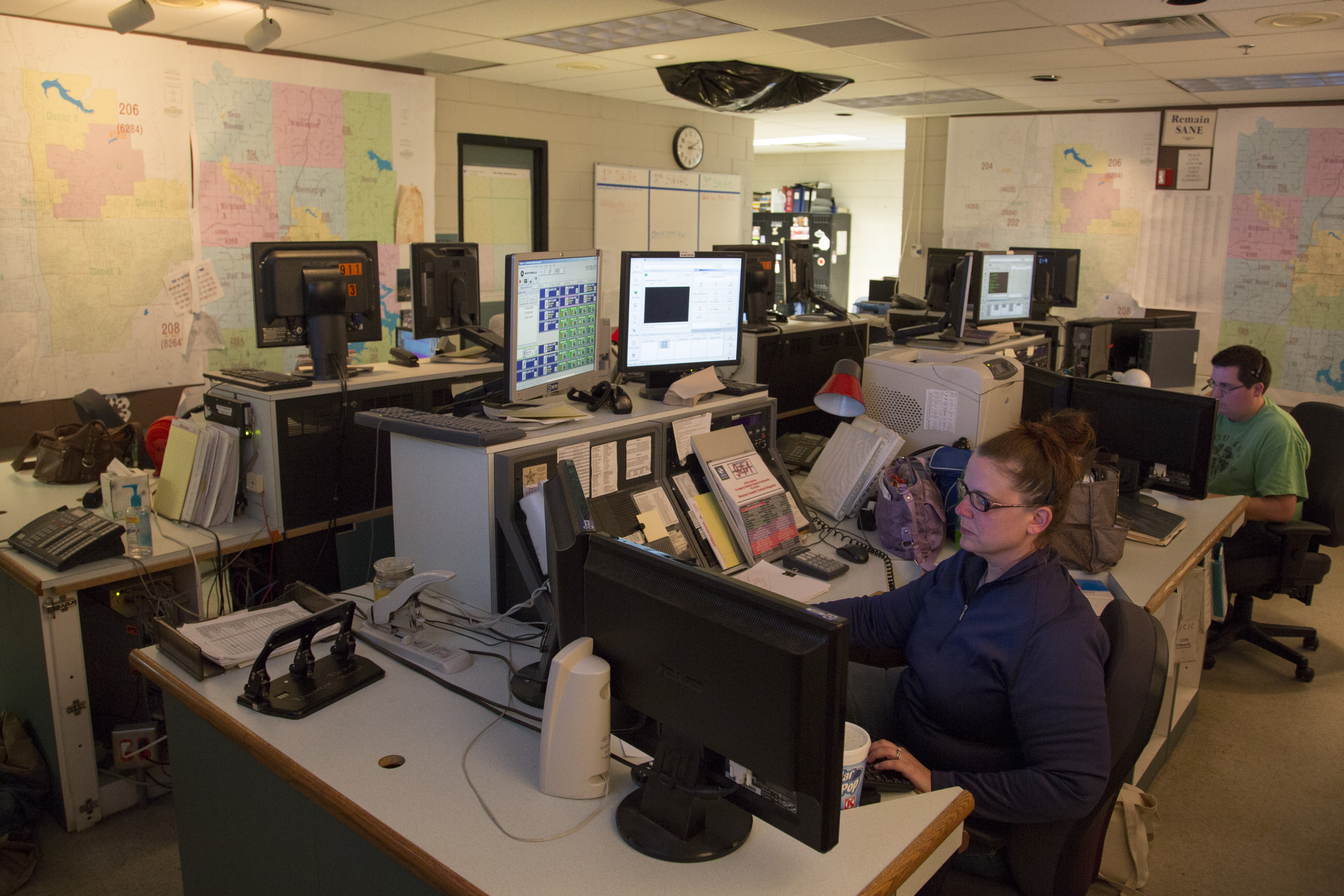 dispatch_2 Published December 4, 2012 at 5195 × 3463 in Calling 911 Employees work December 4, 2012, at Central Emergency Dispatch Center at the Bloomington Police Department in Bloomington, Ind. The center takes calls for all of Monroe County, except for Indiana University.