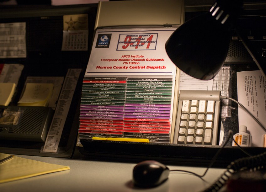 dispatch_3 Published December 4, 2012 at 5046 × 3658 in Calling 911 Various resources sit on a desk December 4, 2012, at Central Emergency Dispatch Center at the Bloomington Police Department in Bloomington, Ind.