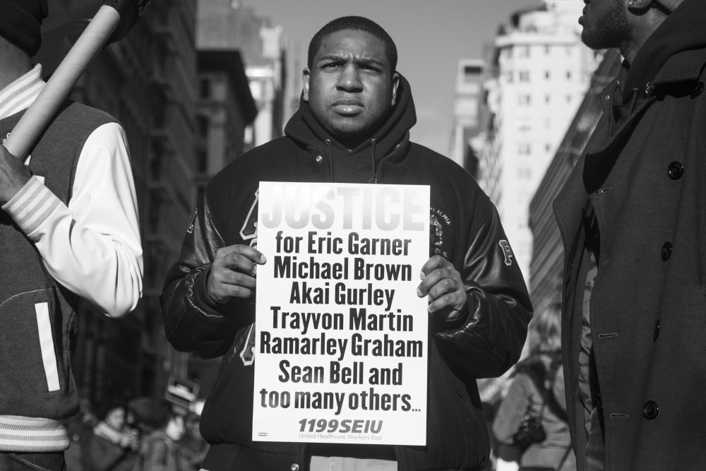 Published December 13, 2014 at 1000 × 667 in Millions March NYC A demonstrator holds a sign memorializing people killed by the police during the Millions March on December 13, 2014 in NYC.