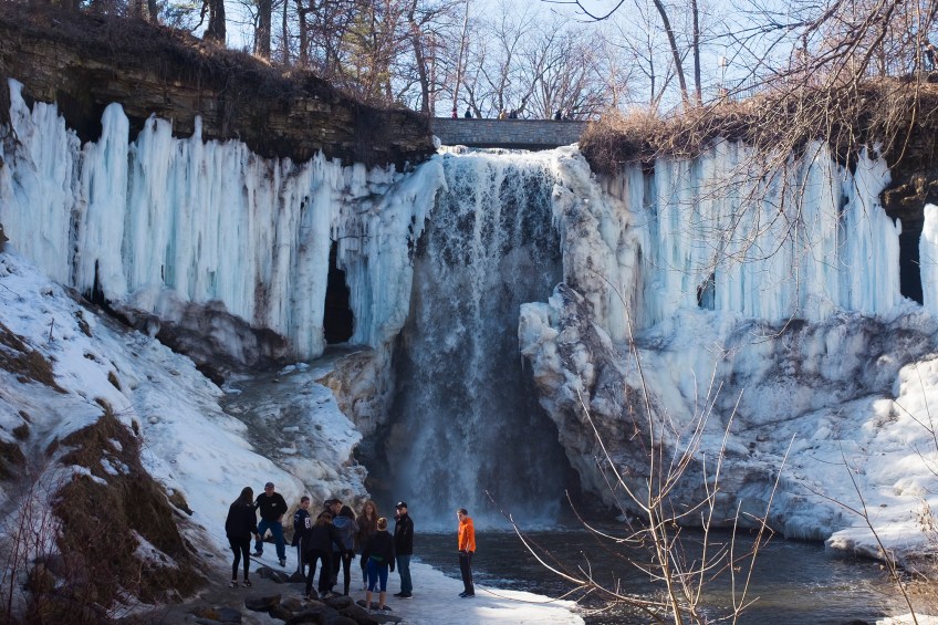 Visitors walk along an ice-covered path at the partially frozen Minnehaha Falls in Minneapolis on February 27, 2016. The paths down to the falls were closed, but that didn’t stop people from making their way down a slippery staircase and onto the ice.