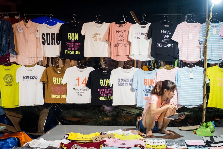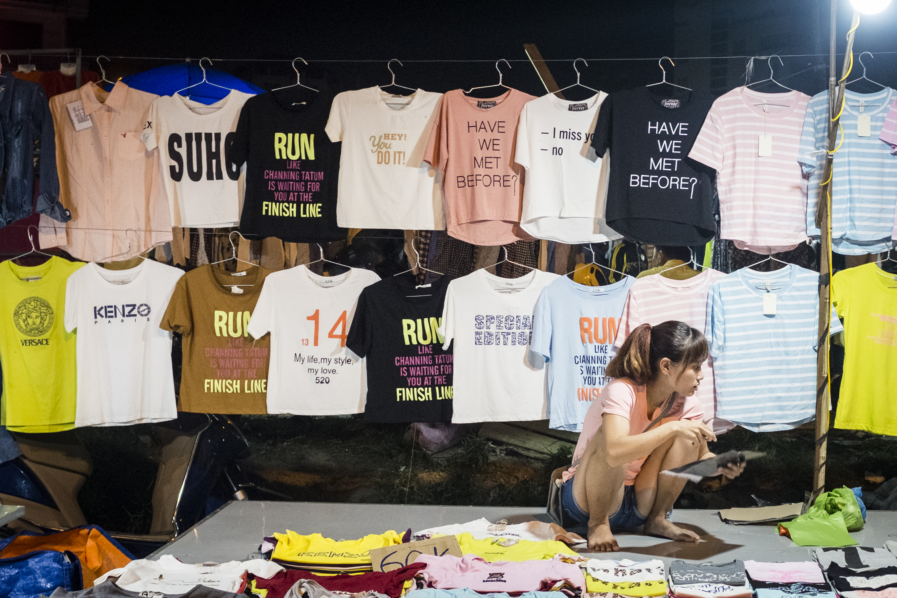 Night Market Published April 18, 2016 at 3075 × 2050 in Follow the Students I would tell you the name of this night market if I could, but all I know is that it was south of the river, devoid of tourists, and full of amusing shirts.