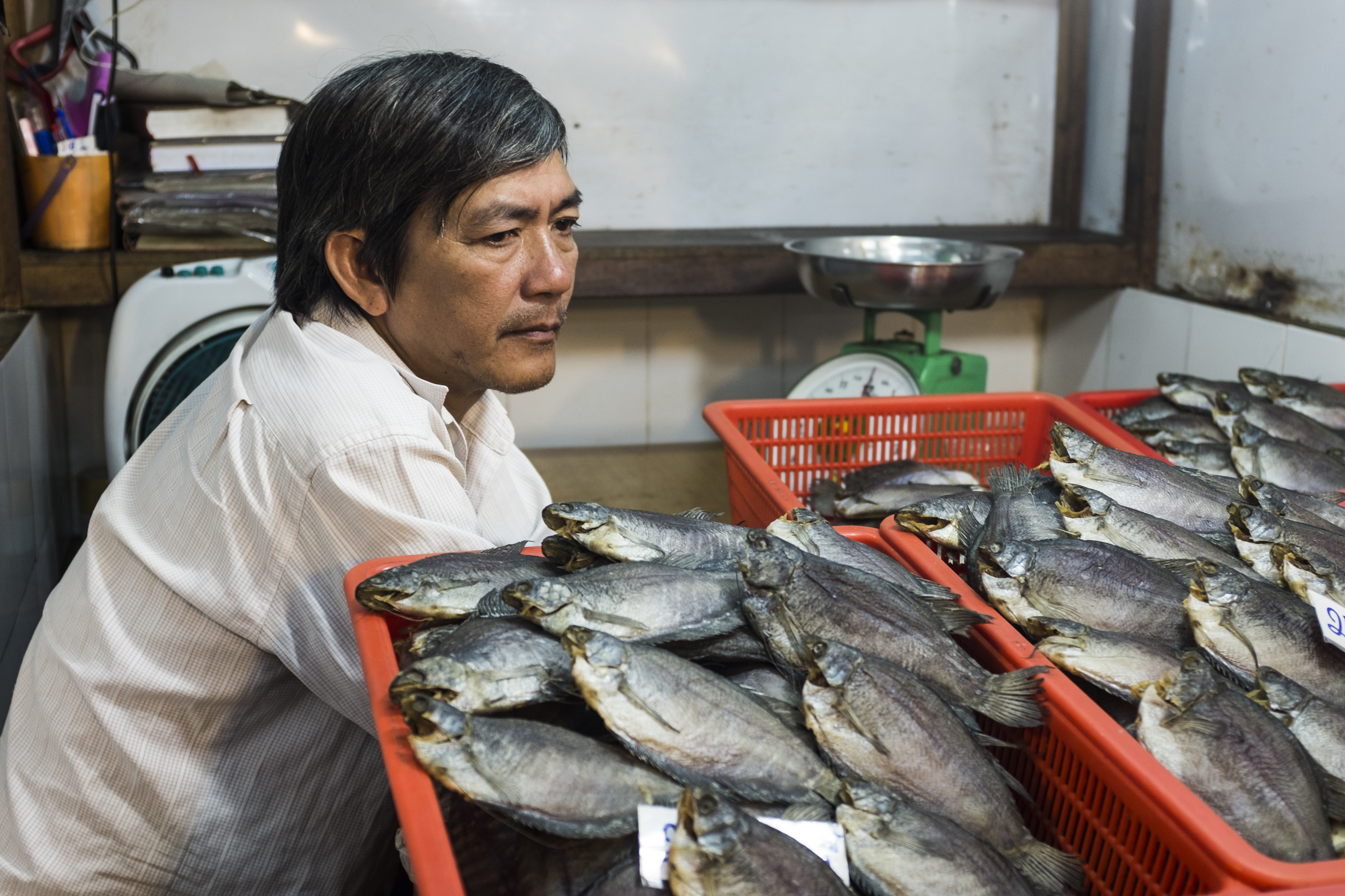 Fishmonger Published July 10, 2016 at 3972 × 2648 in Saigon A man sells fish in Binh Tay Market in Chinatown.