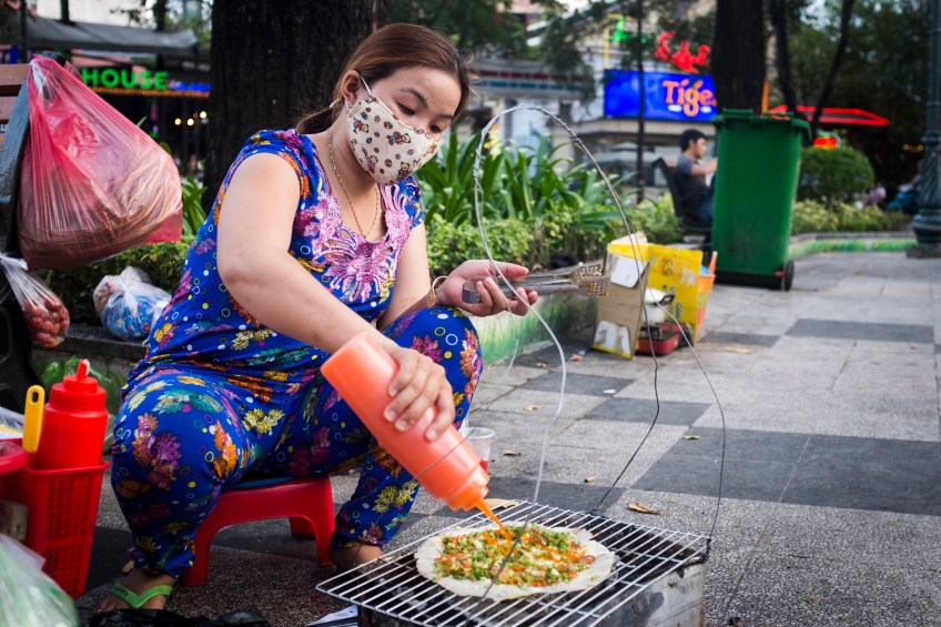 Banh Trang Nuong Published July 10, 2016 at 4485 × 2990 in Saigon In my opinion, some of the most interesting food in Vietnam can be found by following young people. At Turtle Lake you can find banh trang nuong, a sort of pizza made of rice wrappers grilled and topped with egg, pork, scallions, and spicy sauce.