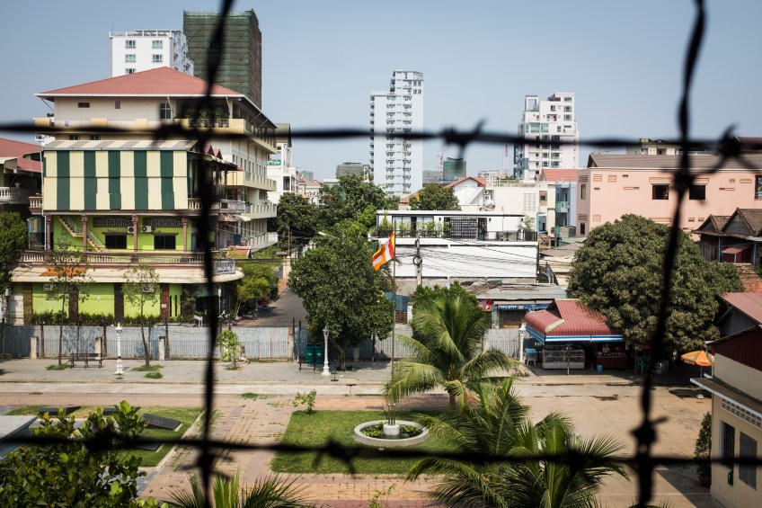 Barbed Wire Published August 12, 2016 at 4896 × 3264 in The Hill of the Poisonous Trees The open-air hallways at Tuol Sleng are caged with barbed wire, which was installed to keep prisoners from jumping to their deaths.