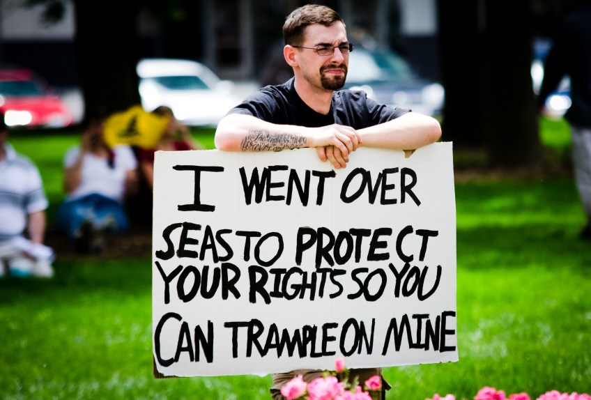 Ball State University student and Iraq War veteren Anthony Seneff holds a sign at a rally in opposition to a Indiana Supreme Court decision Wednesday on the South Lawn of the Indiana Statehouse in Indianapolis, Ind. Several hundred people came together to protest the ruling, which prevents citizens from resisting police from entering their homes illegally.