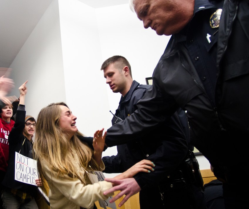 Indiana University Junior Morgan Eldridge is restrained while attempting to run to a protestor being arrested by the IU Police Department during a sit in on Nvo. 28, 2011 at the IU Kelley School of Business. Protestors sat in front of a doorway in a show of opposition to a JPMorgan Chase Bank recruiting event.