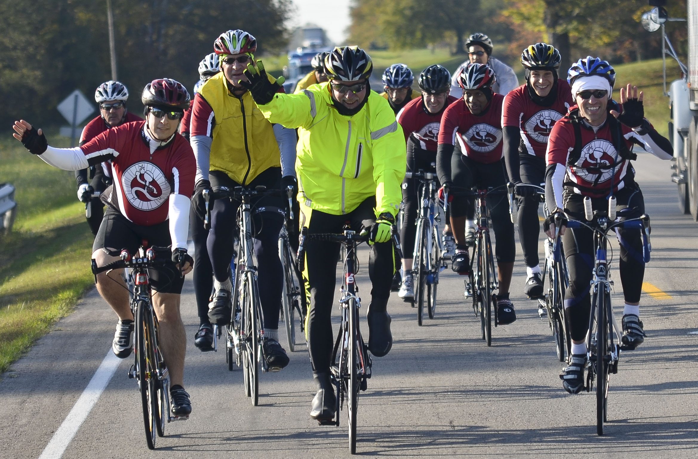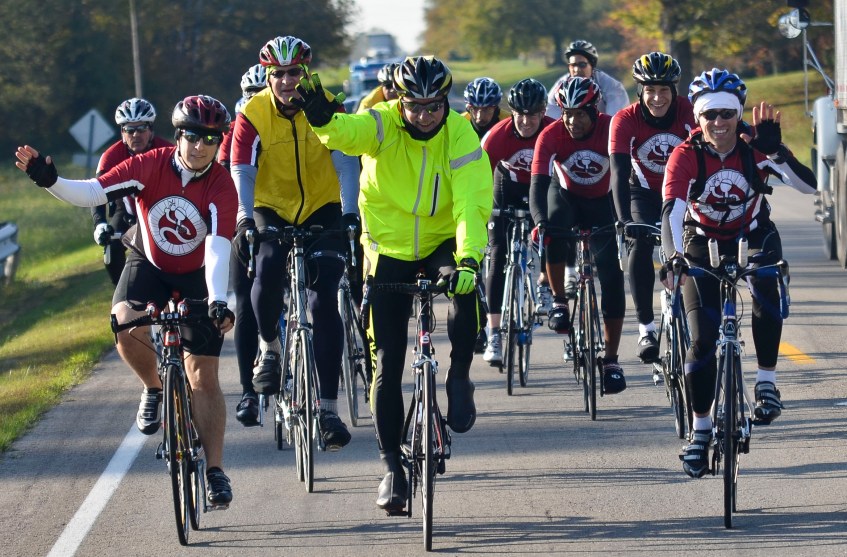 cycling2 Published January 30, 2012 at 2338 × 1537 in cycling2 Riders pull into their first rest stop on Friday, Oct. 21 near Hanover, Ind. The first leg took them 40 miles of their 200 mile two-day trip.