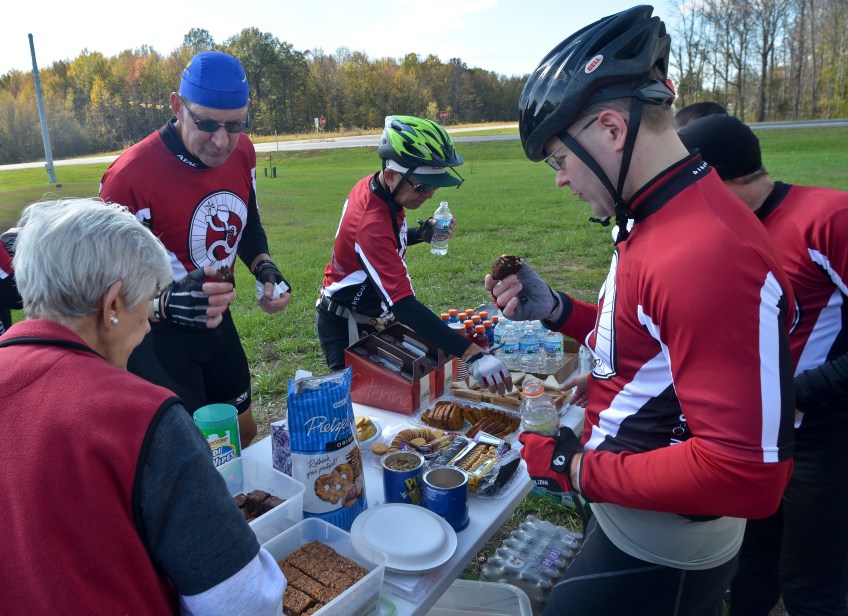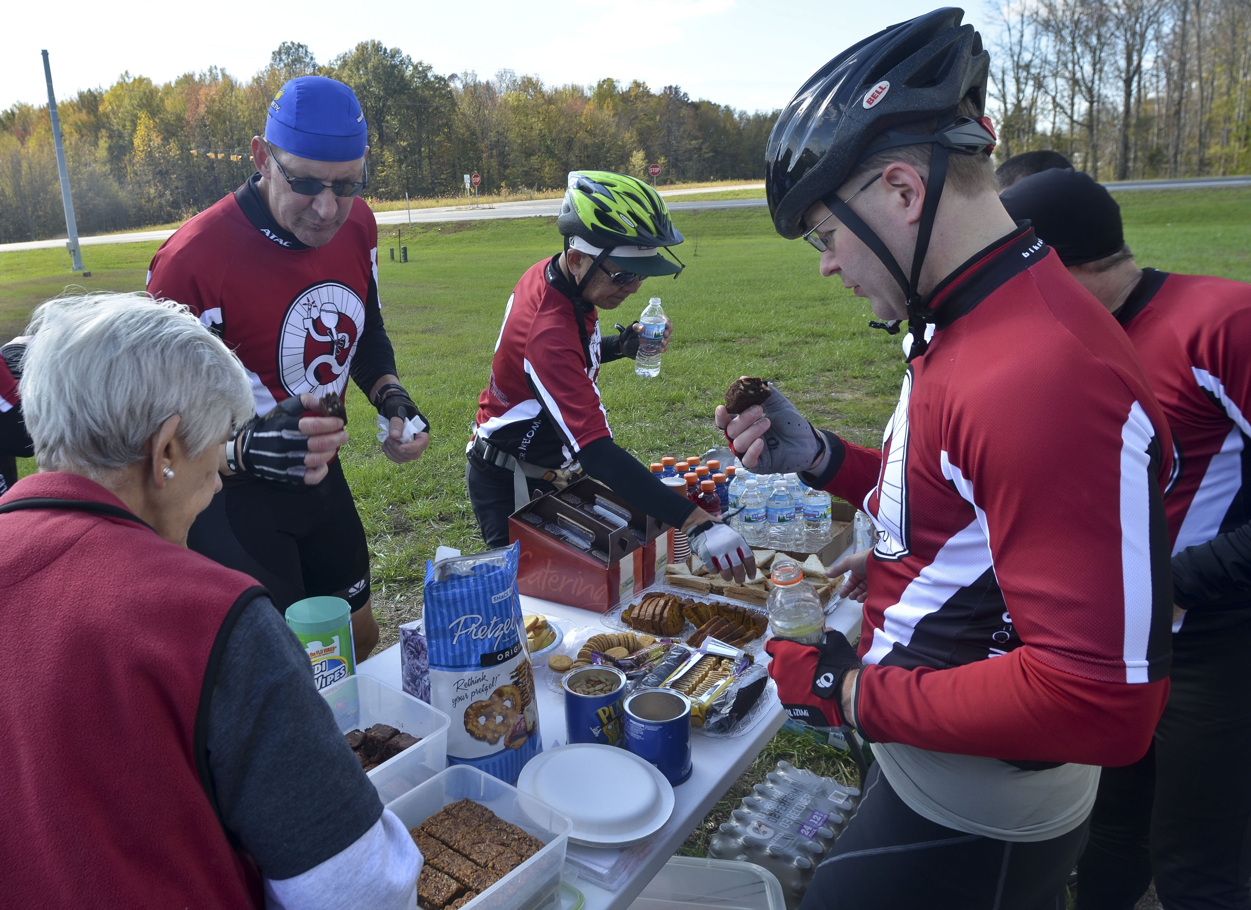 cycling5 Published January 30, 2012 at 4149 × 3018 in cycling5 Riders stop for snacks and drinks at a rest stop on Friday, Oct. 21. The team stopped frequently to stay nourished and hydrated.
