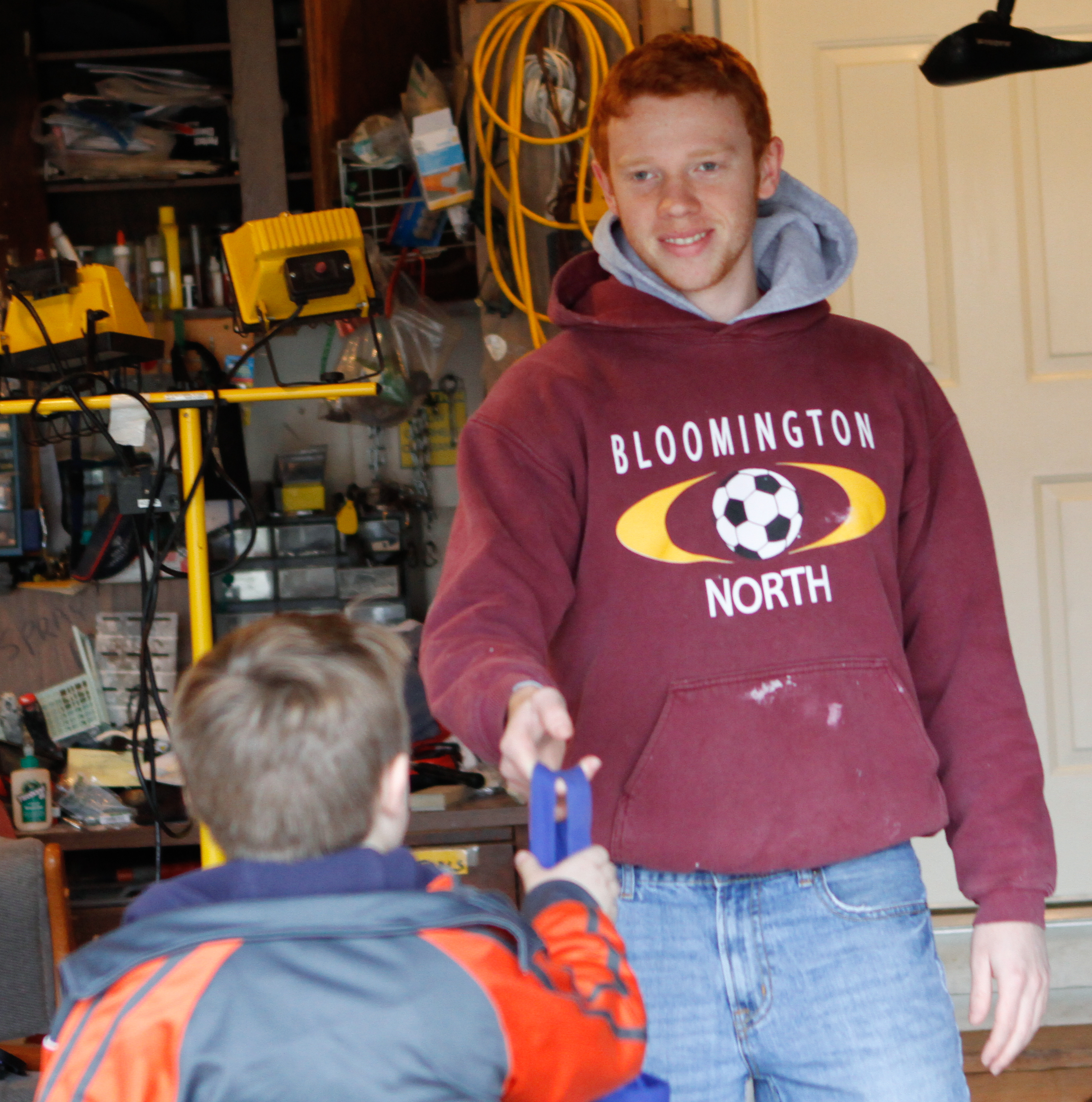 Ivy Tech sophomore Alex Minor hands a bag of canned goods to Avram. Avram and the other volunteers were told to give bags to people to take inside their homes, based on the idea that people would put more in a bag than they would fit in their arms and bring outside.