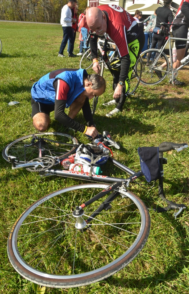 cpoy_rnab_15 Published October 27, 2012 at 1287 × 2000 in Miles for Myeloma Eddie Srour (bottom) and Gary Dove work on Srour’s bicycle during a rest stop on Friday. The road was tough on the bikes, and the riders frequently had to make minor repairs. Like Loading...