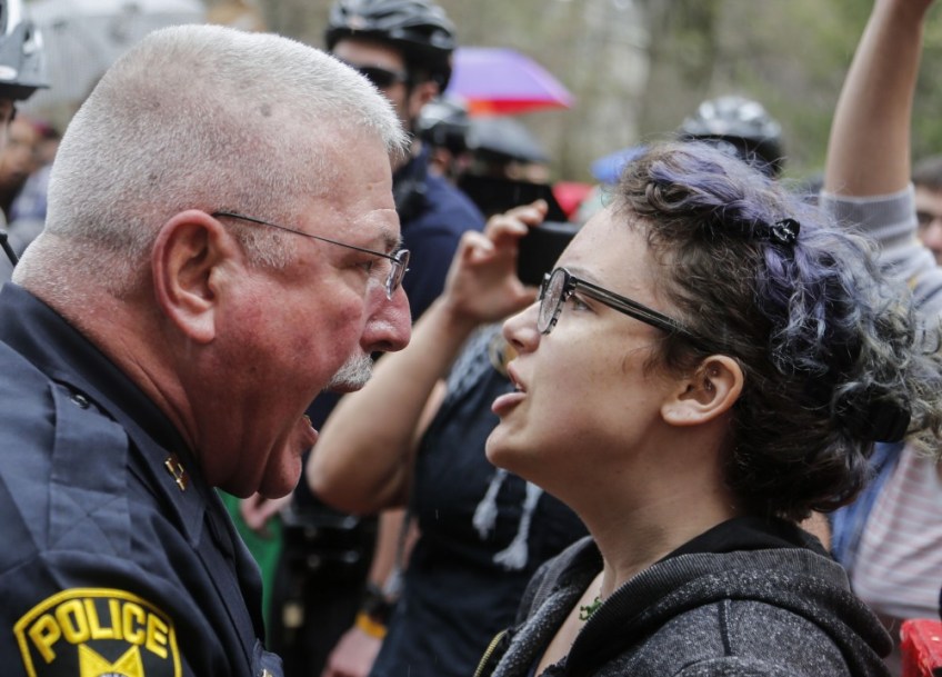 Indiana University Police Department Captain Thomas Lee and a protester yell at each other outside of a Board of Trustees meeting Thursday, April 11, 2013, at Franklin Hall on IU’s campus in Bloomington, Ind. Students, faculty, and community members convened to “strike,” protesting issues such as tuition hikes, employee wages, and low minority enrollment.