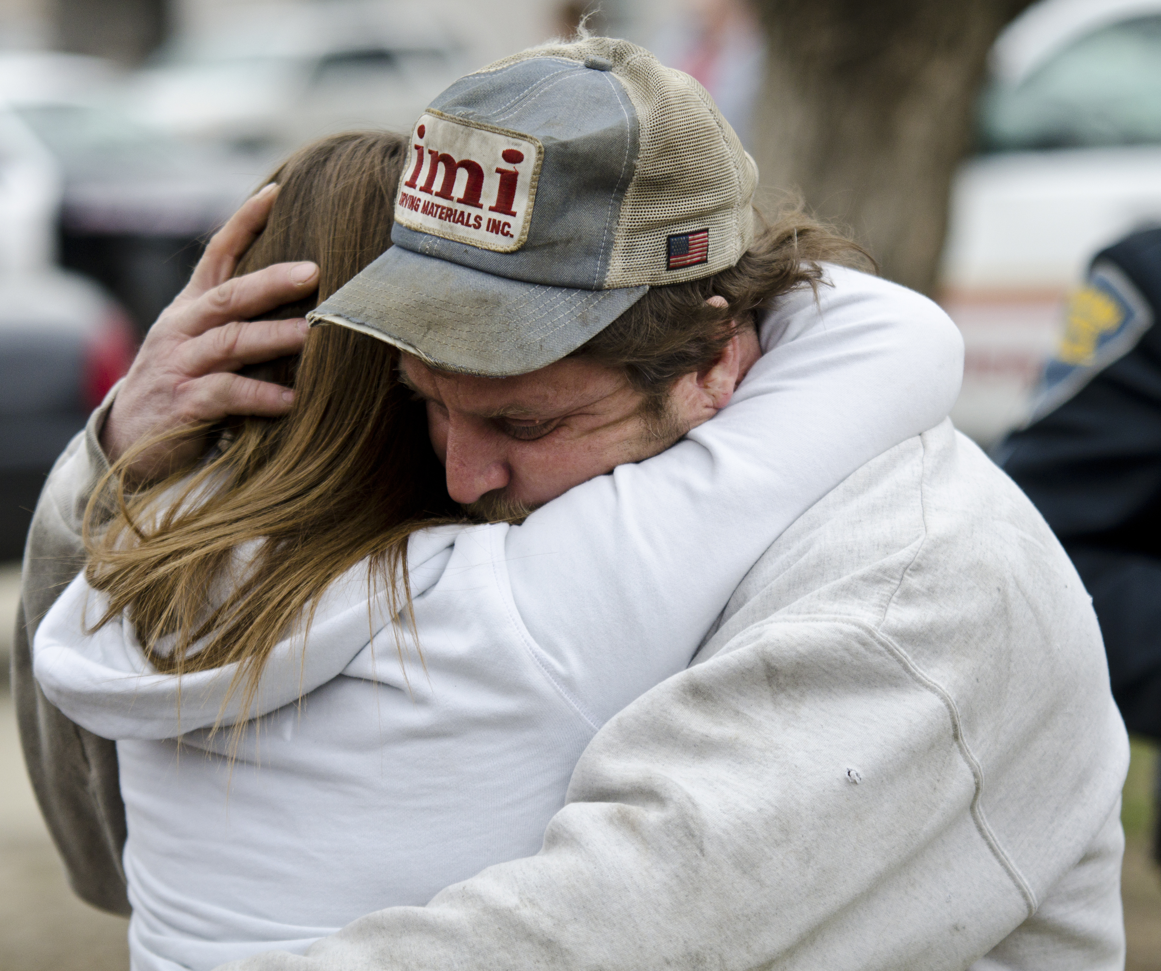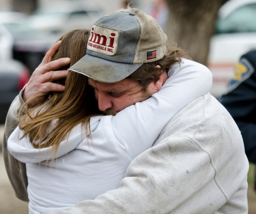 Gary Allen embraces his daughter on March 25, 2011, outside of Martinsville West Middle School in Martinsville, Ind. after she left her school, which was left on lockdown after a shooting. 15-year old Michael Phelps shot 15-year old Chance Jackson, fleeing the scene before being apprehended by authorities.