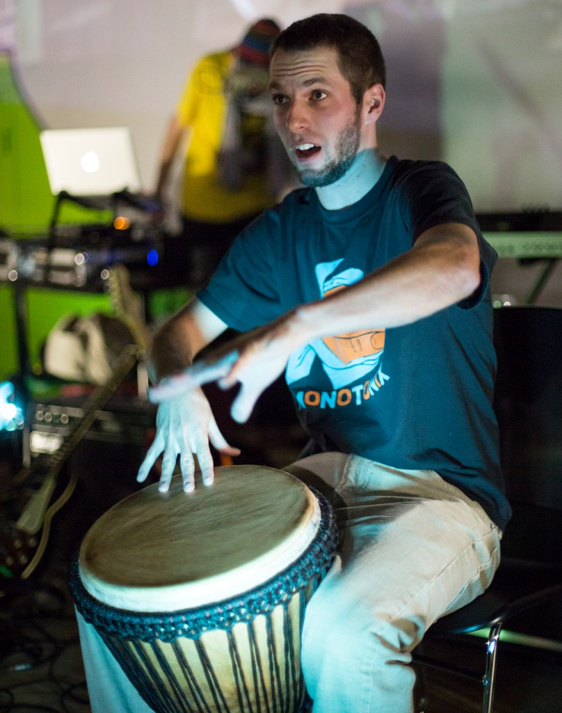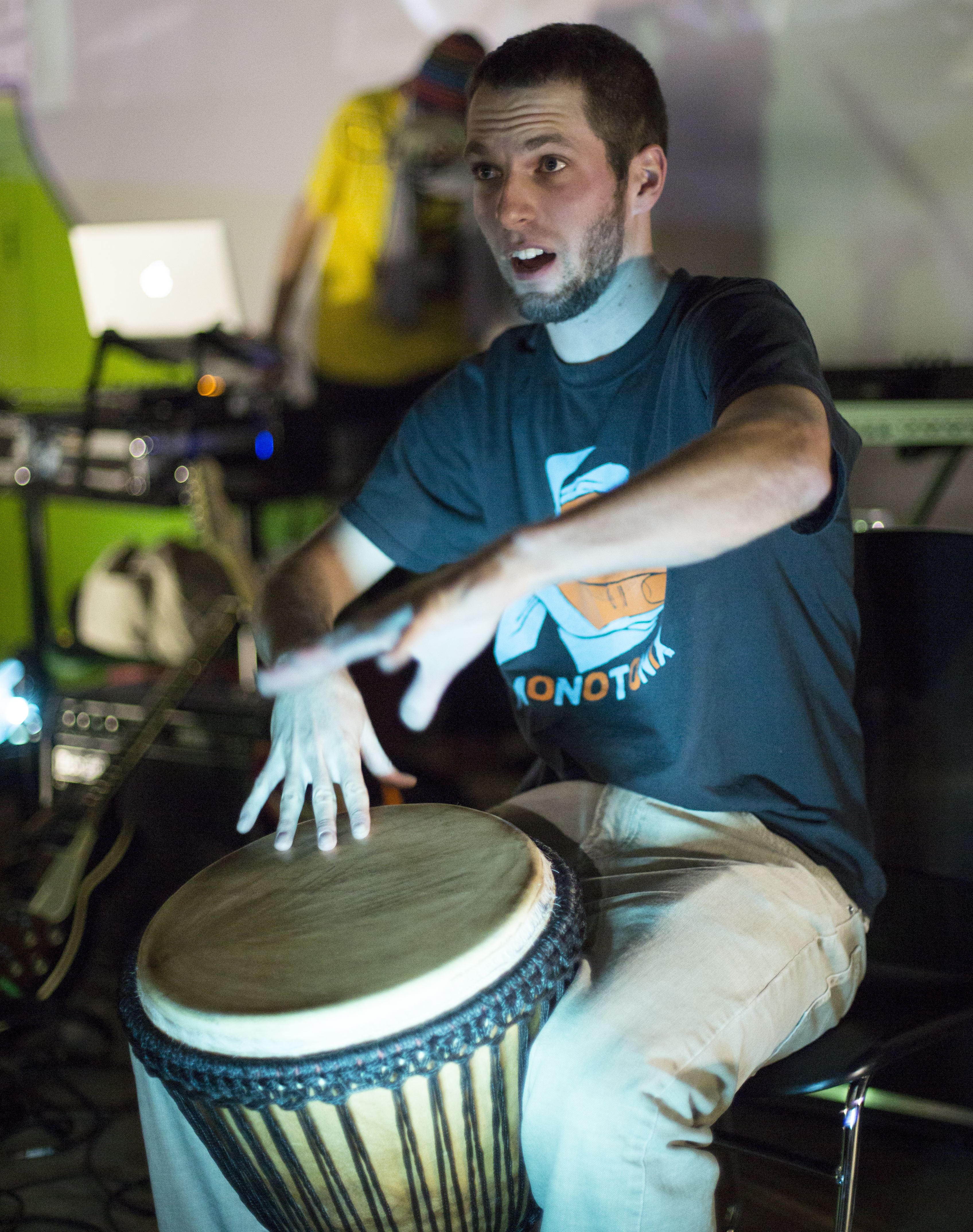 Published December 22, 2012 at 3392 × 4294 in Ted Somerville plays a djembe at the end of a set with his band, Sweet Poison Victim.
